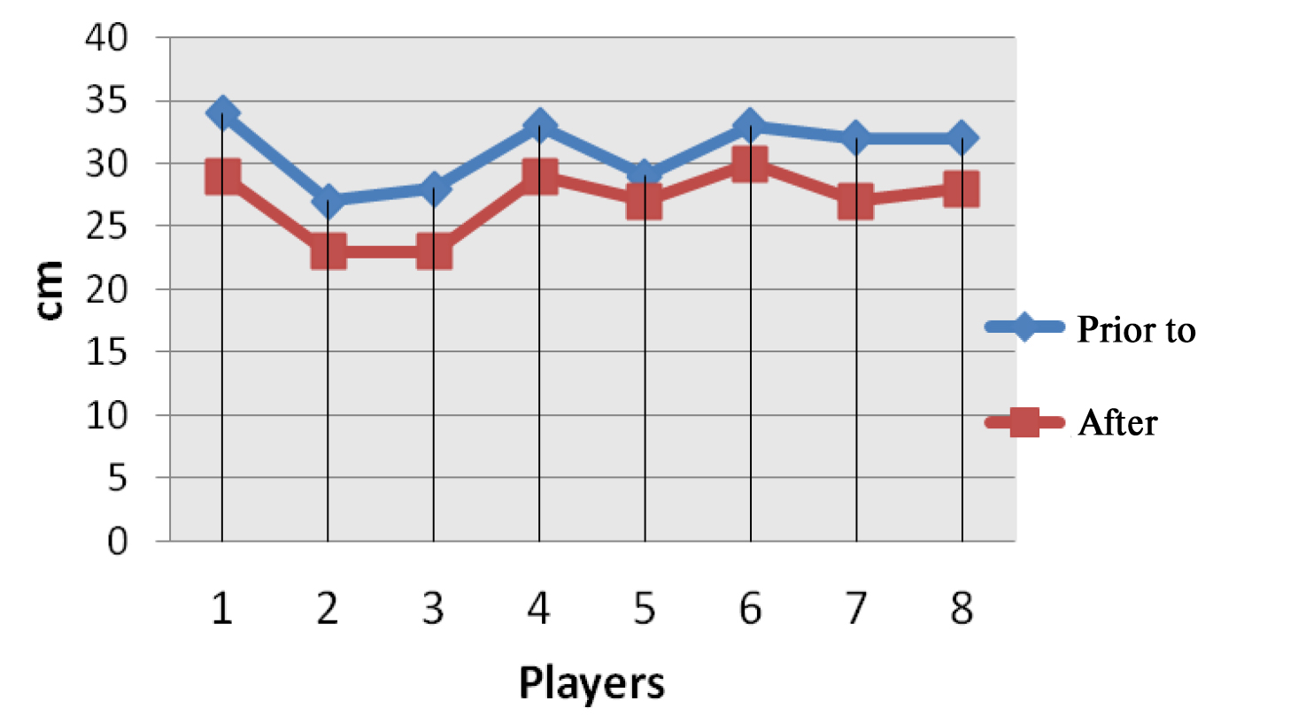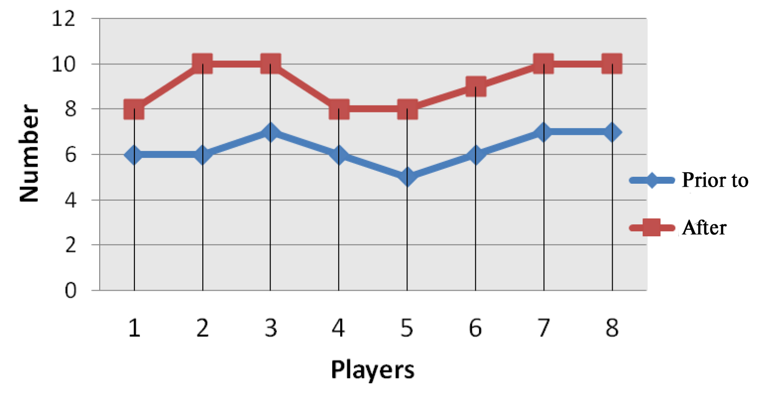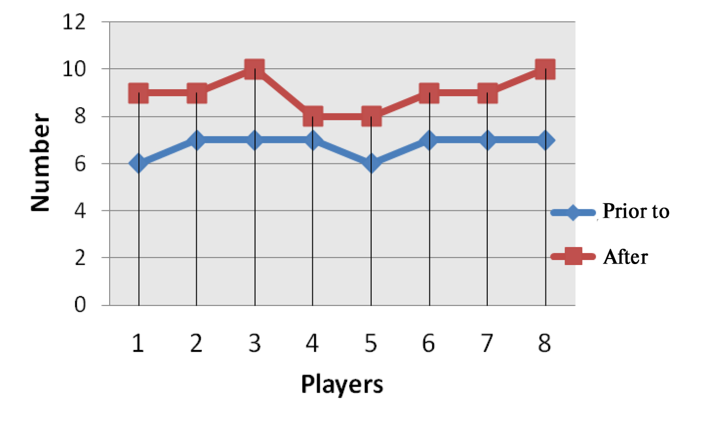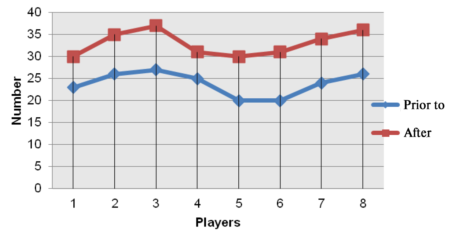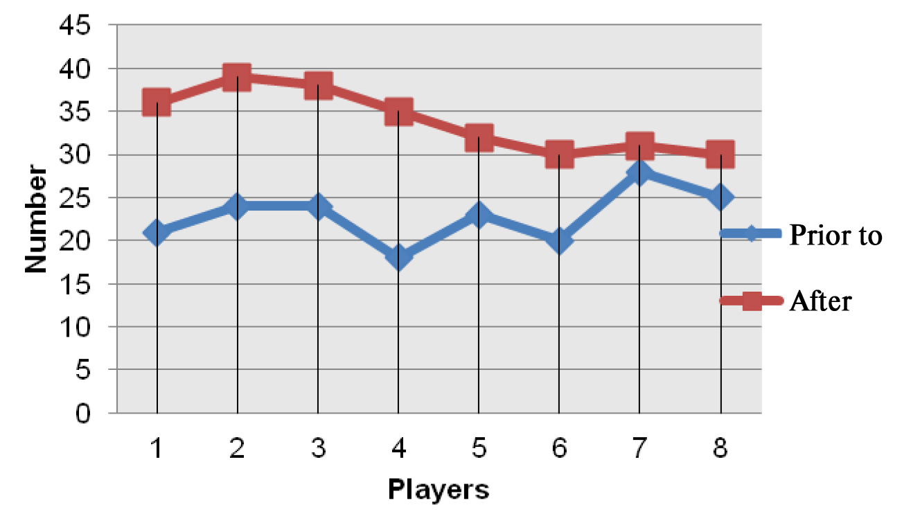 It should be noted that good individual progress was largely due to the individual determination for success. Of special interest were the Ten Diagonal Right Chop Service test data (see Figure 3). Initially, seven tennis players performed 6±0.15 services rated with mark 3, and one player failed the test. The final test showed the progress to 9±0.15 services rated with mark 4 and four players got “excellent” marks 5, with the performance growth rate of 50%.