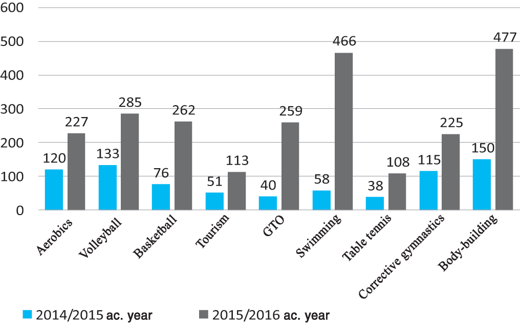 The highest growth in the numbers was noted in the swimming and body-building disciplines that might be due to the high versatility of the training courses offered under these disciplines.