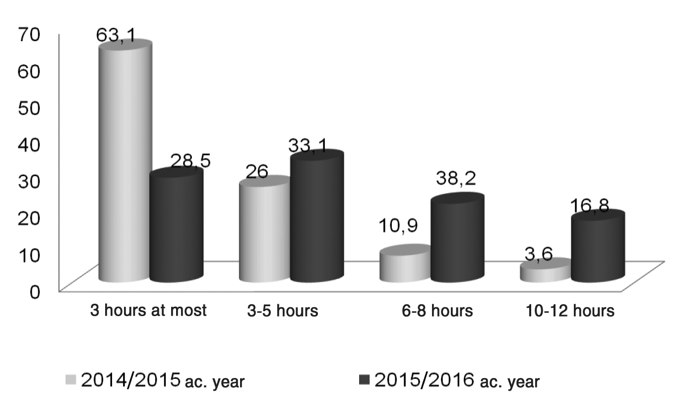 It should also be mentioned that the compliance of the valid hygienic standards in the physical training courses has increased as verified by the numbers of the standards-meeting students. Furthermore, in the academic year of 2014-15, only 16.5% of the students were reportedly trained for six-plus-hours per week versus 55.0% in the academic year of 2015-16. This is a striking growth of more than three times: see Figure 2.