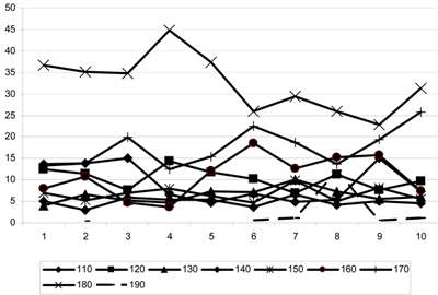 The analysis of Fig. 2 shows that during the training cycle the work performed at the level of HR, equal to 170 bpm, changed heterochronously. At the beginning of the cycle the load performed at HR 170 bpm, increased after one training session, after the 6th session it gradually increased and decreased at the last session, giving way to the load at the level of HR, equal to 180 bpm.