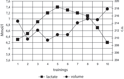 The changes in the volume of work performed and the increase of blood lactate concentration in judokas are shown on Fig. 3. The changes were not interrelated at all up to the 5th training session, then the volume of work performed and blood lactate developed in different directions, the volume of work increased and the blood lactate decreased. Taking into account that HR in this period rose too (Fig. 2), the increase of the threshold of aerobic-anaerobic performance of judokas can be stated.