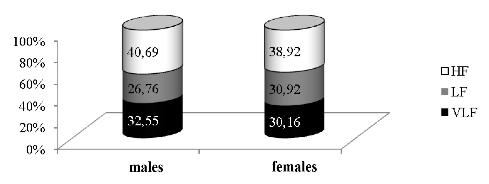 Maintenance of the optimal level of autonomic functions is the most important indicator of successful adaptation [1]. Heart rate is the most labile indicator, by the changes of which we can be judge not only of the state of the cardiovascular system, but of the whole body as well. The analysis of the ratio of waves, forming the general spectrum of heart rate variability of the examined students, revealed that the greatest contribution to the spectrum structure is made by the HF-component, which reflects the spectrum power within the high-frequency range and characterizes vagal control over heart rate. The predominance of the high-frequency component testifies to the intensive parasympathetic activity of the autonomic nervous system among students residing in KhMAR-Yugra (Fig. 1).