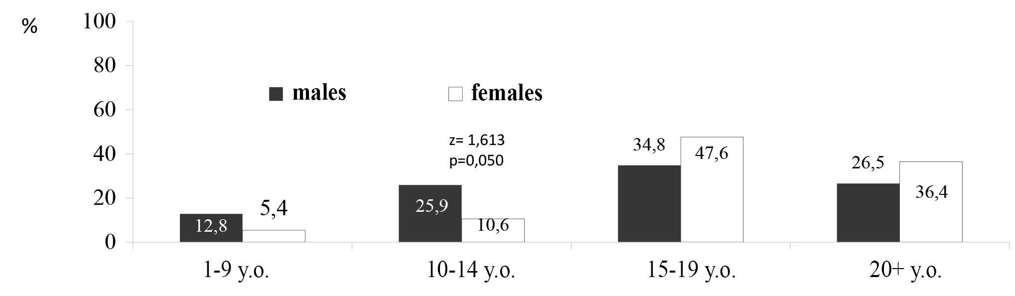 Fig. 3. "Blood vessels age" exceeding formal age of examined students, %