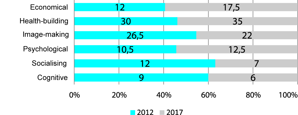 We rated the economic motivations as the most affected by the ongoing economic crisis as highly dependent on the sagging income levels: in this group the motivations were found to fall by 60% and their impact on the fitness club attendance was found to grow from 11% to 20%. The image-making motivations were found to notably decrease as well that may be explained by the recent shift in the trainees’ needs towards health and psychological (emotional) agenda, plus staff reductions in the mid-level corporate management (attending fitness clubs).