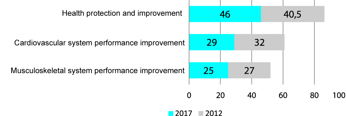 The core and potential clients were found to give much more attention to the health protection and improvement needs that may be explained by the inflation processes on the one hand and the notable slow-down in the pensions growth process. The health motivations of the trainees may be classified into the following three components: see Figure 2.
