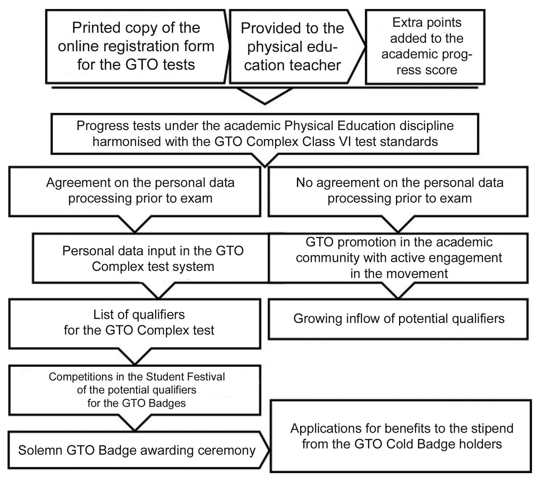 At the first stage of the proposed model implementation, the process was supported by a special education curriculum “GTO Complex test procedure for education establishments” scheduled for implementation in November 2017. Under this curriculum, every teacher will have the right to register progress test rates under the academic Physical Education curriculum in close cooperation with the GTO Complex Test Centre to secure the test process being harmonised.