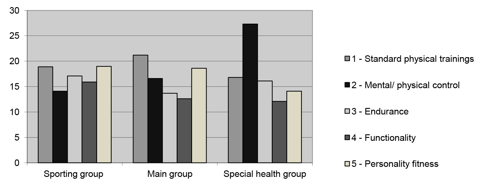 Study findings and discussion. The new service-specific physical education model was designed to secure an optimal balance of the physical education and sports elements (factors) and the relevant service fitness tests: see Figure 1 hereunder. Contribution of the standard physical education and sports training element to the service fitness and skills of the sporting, main and special health groups was tested to amount to 18.9%, 16.8% and 21.2%, respectively.
