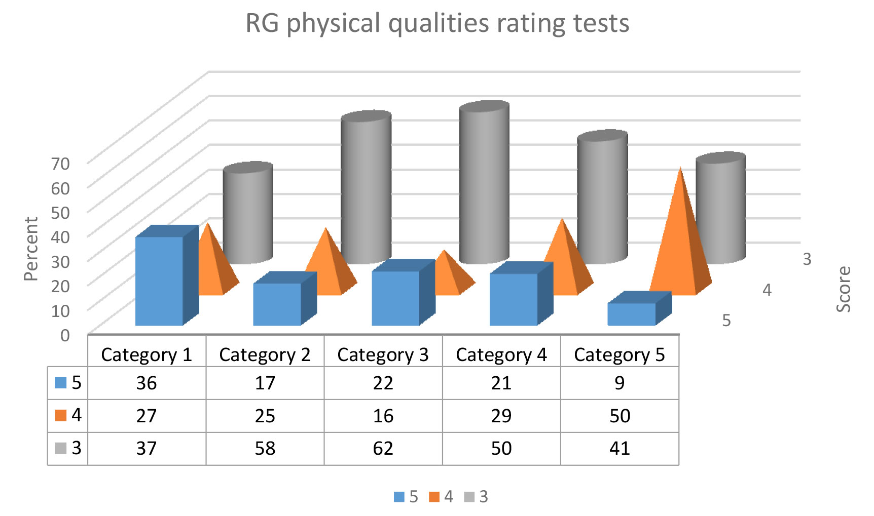 Figure 1. RG scores in the five tests: (1) prone push-ups; (2) standing long jump; (3) seated forward bends; (4) 100m sprint; and (5) 2000m race tests