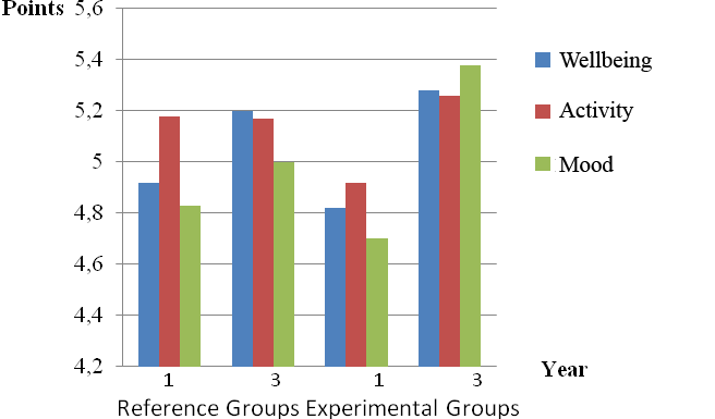 The group progress was tested on a systemic basis by physical fitness, physical health and mental/ emotional state tests. The physical fitness was rated by the standing long jump, floor sitting straight bends, one-leg closed-eyes balancing, 12min walking/ running, supine trunk lift, prone push-ups andpull-ups on a horizontal bar tests. The physical health was rated by the V.I. Belov and G.L. Apanasenko express test [1, 2]. And the mental/ emotional states were rated by the standard WAM (wellbeing, activity and mood) tests. In addition, the sample was surveyed prior to and after every academic year to rate variations in the students’ attitudes to the physical education service.