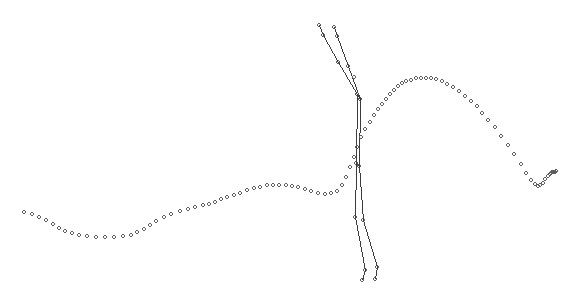 Fig. 1. Kinematic structure and trajectory of the body general centre of mass (GCM) displacement during performance of the connecting move of acrobatic exercises round-off – salto backward tucked on a beam.