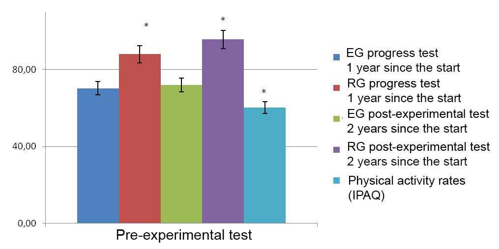 Results and discussion. The EG trainings were tested to significantly improve health, physical wellbeing and physiological comfort, independence and life quality. It is important that the progress was tested both at the active training stage and upon completion of the physical education course: see Table 1.