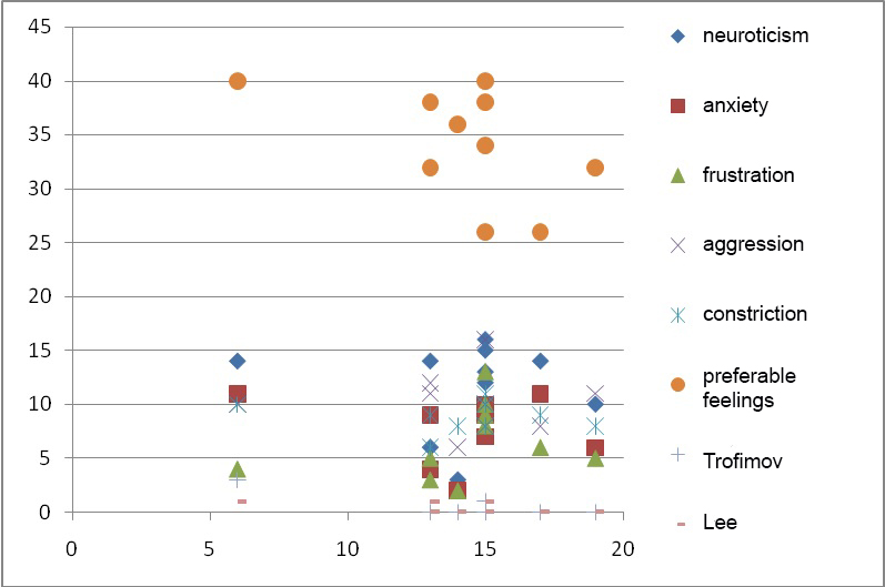 The musculoskeletal system functionality was rated using the Trofimov and Lee questionnaire survey forms. The students were asked to indicate which movements during their everyday self-service caused difficulties and to what extent. The total pints were deemed the index values: the higher the score, the worse the state of the musculoskeletal system. Among the methods of psychological testing were: Eysenck questionnaire used to determine both the type of temperament and neuroticism (prevailing emotional states), Dodonov’s methodology used to determine the dominating needs, and psycho-geometric test.