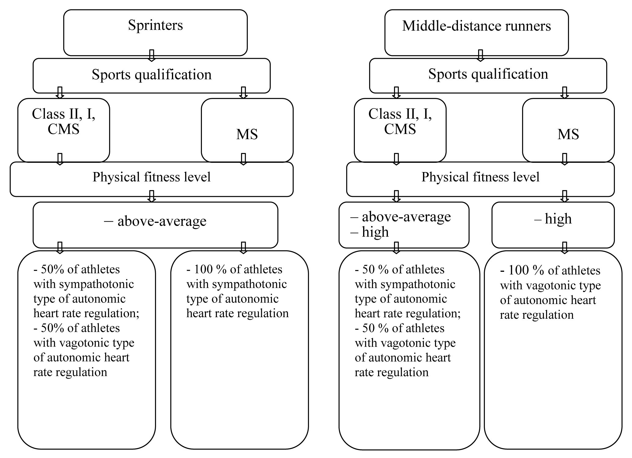 Figure 1. Distribution of sprinters and middle-distance runners by physical fitness level and type of autonomic heart rate regulation