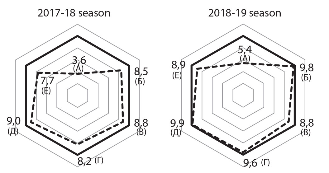 In the highly successful 2018-19 season (hereinafter referred to as “successful”), the cyclic workloads were relatively lower (by 90 hours) mainly for account of the lower intensity zones 1-2 and intensity zone 3-5 trainings in the precompetitive period; whilst in the competitive period the intensity zone 3-5 trainings were increased. Ratios of the unspecific (running, cycling, rowing, simulator) and cyclic trainings were virtually unchanged in both of the periods although their annual volumes were slightly decreased. It may be pertinent to mention the unspecific trainings reduction trend in the successful season, particularly in the strength training domain. The aerobic-strength [6] and intensive indoor strength trainings (with weights of 70-90% of the individual maximums) were seriously cut down in the successful season whilst the low-intensity multi-repetition circular, static-dynamic [7] and static endurance trainings were kept at the same levels. There were no notable inter-seasonal changes in shooting trainings.