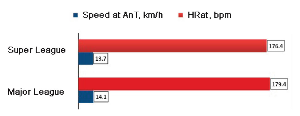 Anaerobic exchange threshold (AnT) - the HR level, at which the body changes from the aerobic to anaerobic mechanisms of energy supply - directly correlates with the physical fitness level and age. In the Major League handball players, the anaerobic threshold HR (HRat) amounted to 179.4±8.1 bpm and in the Super League ones - 176.4±8.8 bpm. This is due to the fact that junior handball players have a higher AnT rate as opposed to senior handball players. The differences in the HRat values between the Major and Super League groups were statistically significantly at p≤0.05 (Fig. 3).