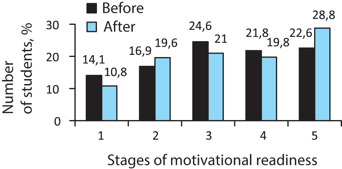 Figure 1. Distribution of students before (before) and after the educational control action (after) depending on the stages of motivational readiness to change their low physical activity.