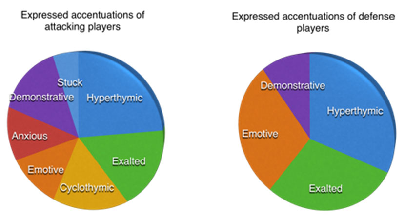 The data on character accentuations of female futsal athletes with different positions (Fig. 1) reveal the obvious similarity of some of the scales, expressed hyperthymic, cyclothymic temperamental characteristics, the lack of expressed dysthymia, excitability; these features must be typical of female futsal players. On Figure 1 we can see significant the differences in character traits. The Mann - Whitney U-test was also employed to carry out a statistical analysis of the data to clarify the differences. In addition to the data on expressed accentuations, the data on the tendencies and lack of accentuations were mathematically processed. In the end it turned out that significant differences were determined only in the dysthymic character accentuation at р<0.05; such indicators as “excitability” and “anxiety” were in the uncertainty zone, the rest of the accentuations differences did not reach the statistical significance level.