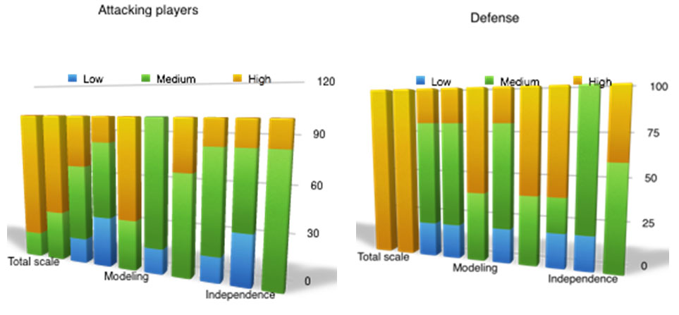 The comparison of scales’ expressiveness degree (Fig. 2) shows some differences between players with different game positions, but their significance has not been confirmed mathematically, except for the “flexibility” scale that turned out to be in the uncertainty zone. These characteristics must reflect the specificity of futsal where each player can be in the situation of both attack and defense; and the specifics of planning, modeling and programming of their actions, actions of opponents and players of their team should be typical for all regardless of game position and are perhaps determined by the team qualification that is yet to be explored.