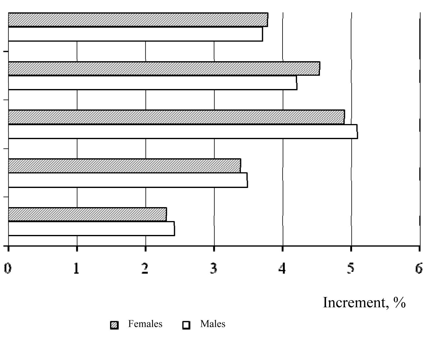 The body mass indices of the female students changed the same way: the weight increases most intensively in the last two years of study (12.2%, p<0.001).