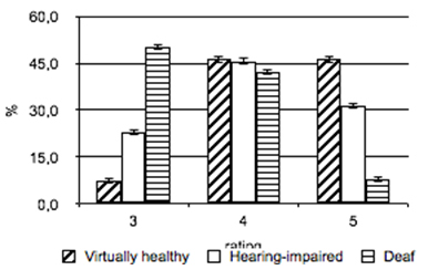 3. Most of the pupils with auditory deprivation were ranked good regarding their speed and strength (45.7% of the hearing-impaired and 42.1% of the deaf) and coordinating (62.9% of the hearing-impaired and 60.5% of the deaf children) abilities. The remaining pupils with bilateral sensorineural hearing loss tended to be ranked excellent, and the pupils with bilateral sensorineural deafness - satisfactory.