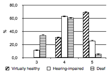 The findings of the estimated level of speed and strength abilities of the studied groups were as follows (Figure 1): among virtually healthy children 7.6% had a satisfactory mark for the jump, the rest were rated as good and excellent (46.2% each). Among the pupils with bilateral sensorineural hearing loss most children (45.7%) were rated «4» (out of 5). In the group of deaf children the low level of motor abilities was observed in most cases (50.0%).