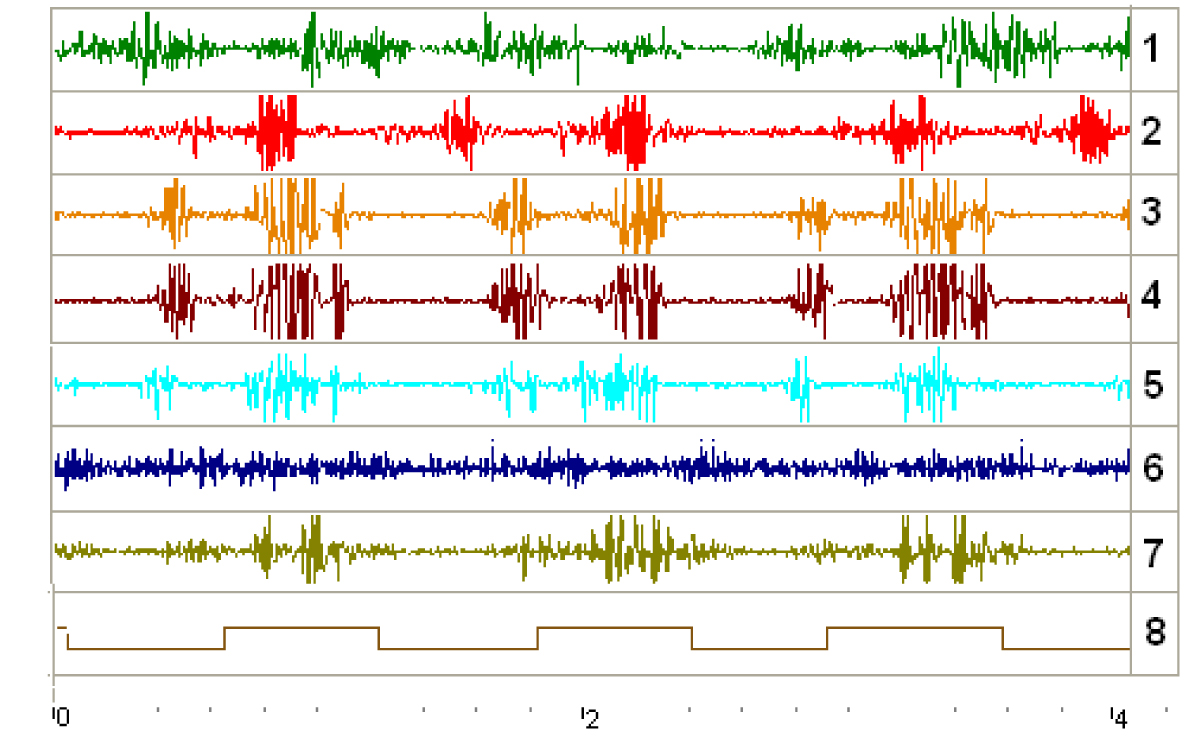 Note: 1 – biceps brachii muscle; 2 – triceps brachii muscle; 3 – vastus lateralis; 4 – vastus medialis; 5 – biceps femoris muscle; 6 – gastrocnemius muscle 7 – tibialis anterior muscle; 8 – synchronization channel of the support phase of the right leg.
