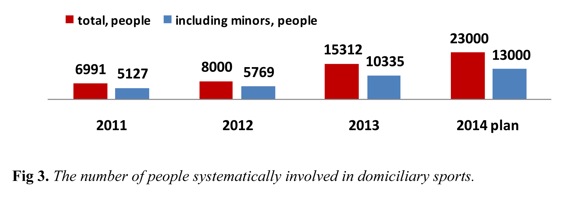 The transition of the sports sphere to intensive development has led to the conduction of the monitoring of the status of all municipal facilities and conditioned the development and implementation of a number of innovative projects: the concept of year-round use of planar structures related to physical culture and sport; the integration of resources of the institutions of basic, post-secondary and higher professional education of children and youth; the organization of domiciliary sports and recreational activities, their optimization and intensification. In 2013, this promoted an increase in the number of people regularly engaged in domiciliary physical culture and sport under the leadership of sports administrators by 91% (the coverage amounted to 15312 people, 6991 (in 2011); 8000 (in 2012) and winning the regional contest "Sports Elite - 2013" in the nomination "The Best Organization of Physical Culture and Sports Activities in the City". And this is not the limit: we are going to increase the number of people systematically involved in domiciliary sports up to 23,000 people in 2014 (Figure 3).