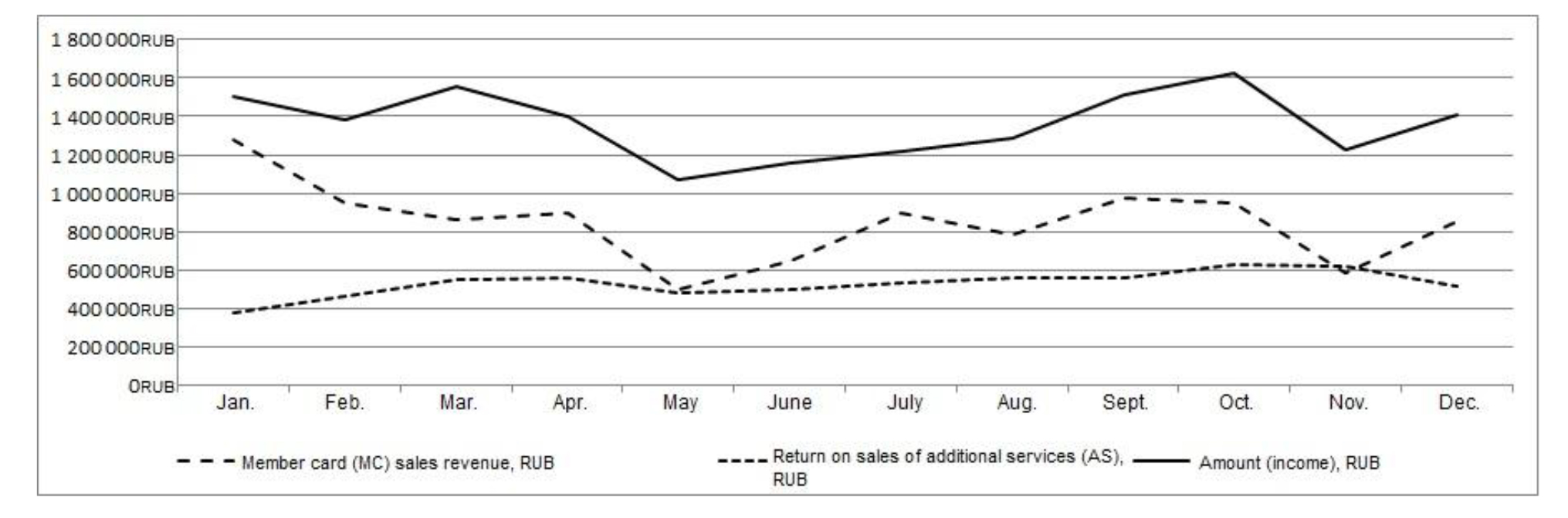 As seen from Table 1, the yearly average member card sales income amounted to 62% of the sales revenue. Such a comparatively low ratio of the member card sales income in the revenue structure is associated with the low member card sales level of the specified club on the background of provision of qualitative and popular additional fitness services (additional services). The member card sales level was deemed to be unsatisfactory, requiring a rise, preventing from getting the estimated profit margin. The member card sales income trends are diagramed in Figure 1.