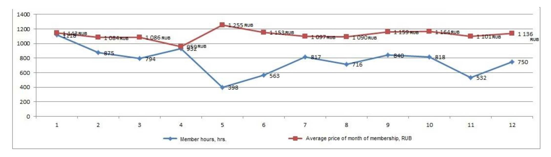 The sales flow can be estimated by the amount of income by months, presented in Table 4 and Figure 1, from the perspective of the general idea of its changes during the year and determine significant deviations in work of the club being studied (for instance, sharp deviations in the income level flow at the end of May and October) [7]. Upon detection of significant deviations from normal indicators typical for the given category of clubs, or from target indicators, the reasons were analyzed. The data on the card sales structure, presented in Tables 2, 3 and 4, complemented by the information on the cost, quality and type of the member cards sold, as well as taking account special promotions and marketing activities for clients, make it possible to determine the reasons of the income level flow deviations from the member card sales and exercise control over them. When analyzing the summary table, we detected a certain regularity between the averaged price of the month for the card and the number of member cards of different types sold during the year. Figure 2 displays the comparison of the average price of the month and total months of the membership sold (the period when the member card is active and the client is the member) during 2012.