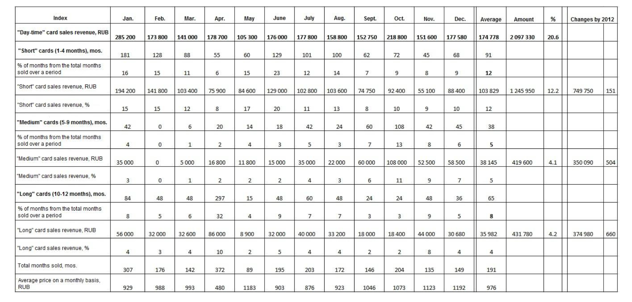As seen from Table 3, the overall contribution of the "full time" cards to the card sales revenue amounted on the average to 79.4% per year. The "long", one year, card sales prevail by the number of months bought, though they slightly decreased compared to the previous year. The largest increase, if compared with the previous year, was observed in the "medium" cards (306%). As a rule, those are 6-8 month cards.