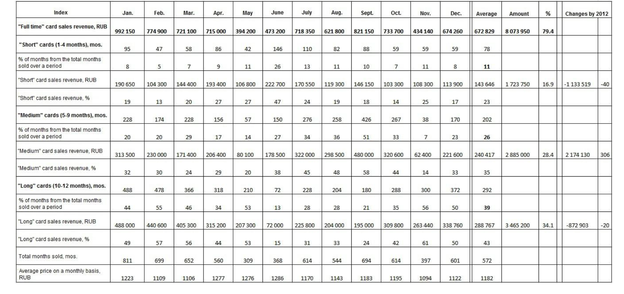 Tables 2 to 4 present the data on the revenue structure of the member card sales in 2013 with the differentiation into "short", "medium" and "long" cards. In order to keep a record of the cards of different duration belonging to the same sub-type (for example, 1- and 3-month cards), they were calculated as months, and then total months sold by the cards of a particular sub-type (group) were considered.
