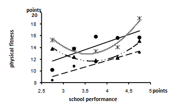 Results and discussion. The correlation of health indicators with the indicators of physical fitness and mental development was studied depending on the grade of the tested pupils. In the analysis of dependences of the physical fitness and school performance indicators of elementary pupils according to their grades (Figure 1) a performance improvement was noted with an increase in the level of physical fitness in grades 1-2. The pupils had a similar increase in the average indicator of physical fitness together with an increase in school performance with the approximate reliability of R2 = 0,719 and 0,918, respectively. For example, first graders with poor performance had their average physical fitness indicators equal to 10.2 points, and those with very good performance - 15.7 points. The third and the fourth graders with both very good and poor performance had higher physical fitness indicators and were characterized by the cuspidal forms of dependence with R2 = 0,958 and R2 = 0,947, respectively. As seen from the differentiated analysis of the interrelation between mental and physical aspects of development, the correlation between these parameters was linear (better performance promoted by physical fitness improvement) only in elementary school (1-2 grades).