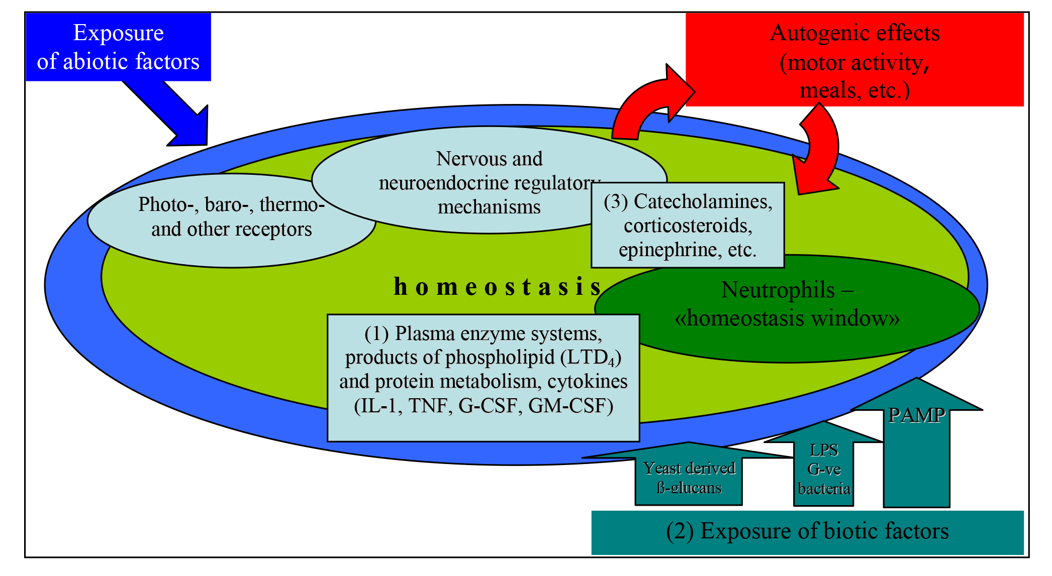 As seen from figure 1, when the internal milieu is destabilized, which is normally accompanied by changes in the products of phospholipid and protein metabolism, as well as in cytokine content and activity of plasma enzyme systems (1), the neutrophil content in circulation and their functional state change, too. At the same time, direct exposure of biotic factors of environment by means of recognition of lipopolysaccharide components of cell walls of the G-ve bacteria through the CD14+-receptors and pathogen-associated molecular patterns (PAMP) through the TOLL-, NOD- and RIG- pattern recognition receptors (PRR) of neutrophils also promotes functional activity of these cells. And finally, exposure of abiotic factors by means of activation of nervous and neuroendocrine regulatory mechanisms (3) has a modulating effect on the state of neutrophils. In the latter case, the use of the mechanisms of voluntary control over dosing of anaerobic and aerobic muscle work during sports activity makes it possible to purposefully control the state of neutrophils and interrelated system functions of the body.