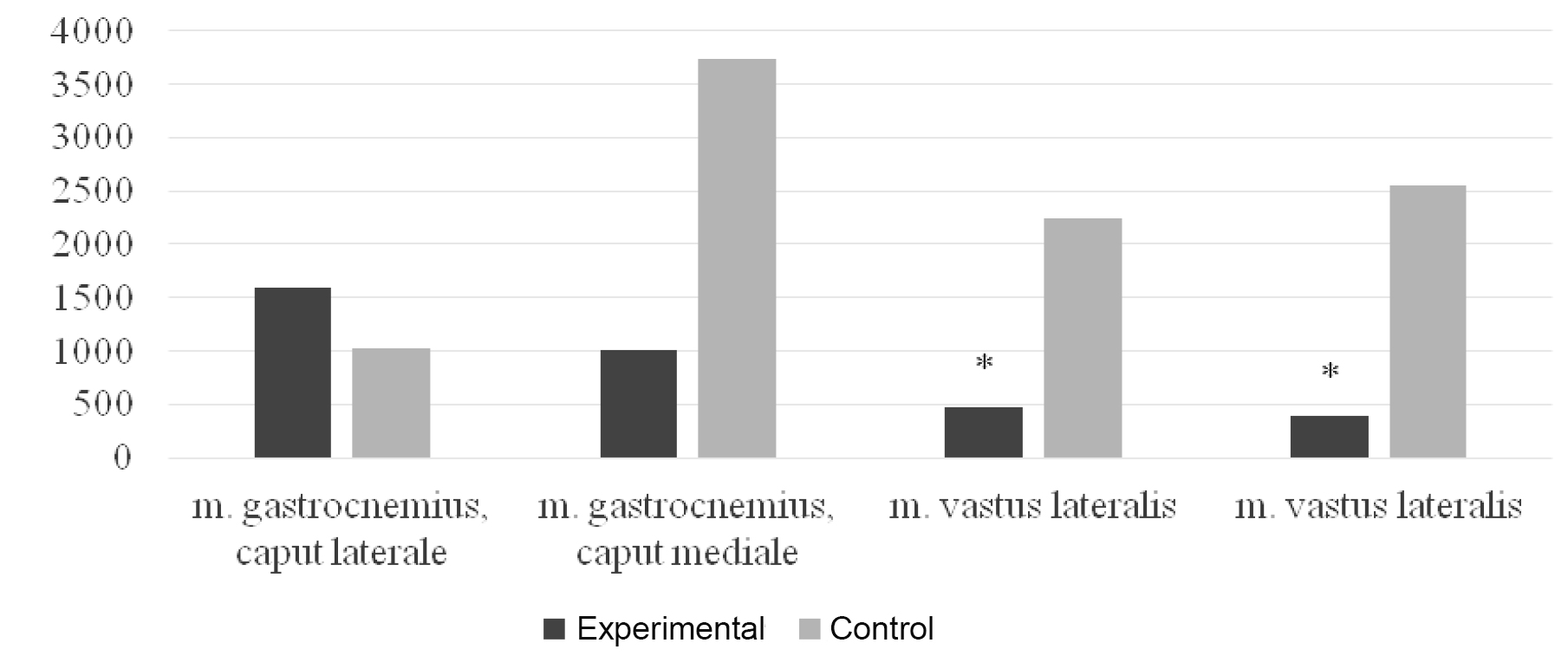 Present on Figure 1 hereunder are the lower limb muscle bioelectrical activity data for the shots performed using the inside of the foot by the Experimental Group vs. the Control Group players. The Experimental Group players having musculoskeletal disorders show reliably lower (p < 0.05) maximum amplitudes of the thigh muscles and the caput mediale of m. gastrocnemius activity data. However, the players having musculoskeletal disorders show higher bioelectrical activity data amplitudes for the caput laterale of m. gastrocnemius (1594.4 ± 121.1).
