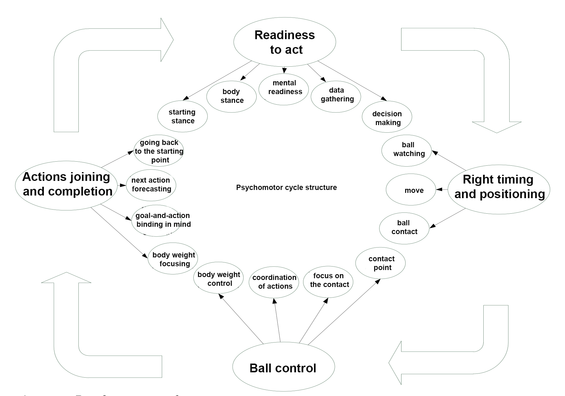 To attain the above study objective, we developed the psychomotor cycle structure geared to help the players master and step up the two-hand overhead pass technique. Psychomotor cycle means herein the set of mental and motor skills that provides a basis for every technical and tactical action in volleyball [4]. These actions will go in certain repeated sequence driven by the technical skills and may be broken up into the following four main phases: