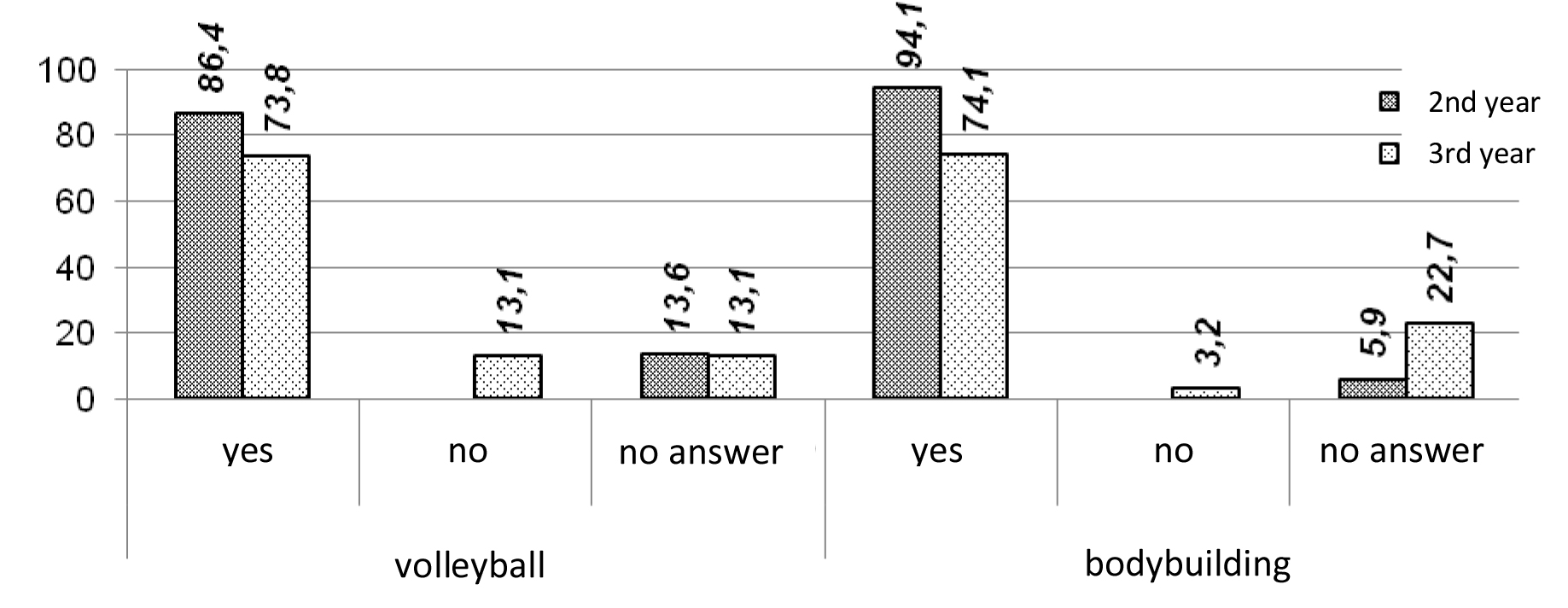 More than 80% of volleyball players like to participate in competitions or would like to join one of the university teams and start to take part in university events. At the same time, more than 60% of 2nd and 3rd year student-bodybuilders are not interested in competitive activities, according to their answers they do sports only for themselves and do not care about competitions.