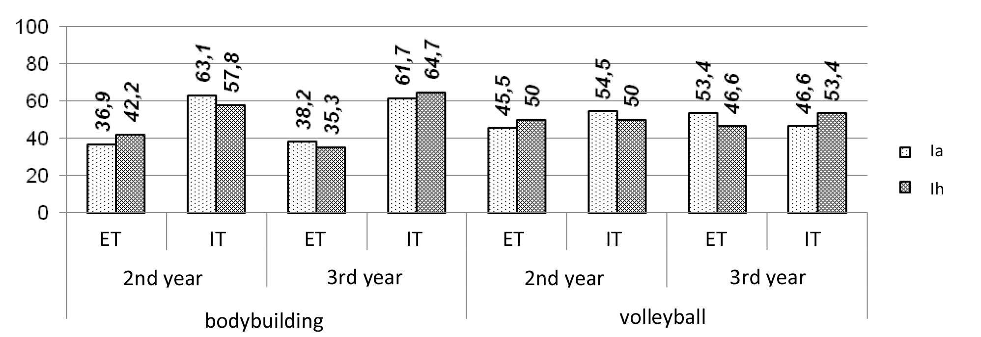 There are two reasons why we surveyed the students of these two elective courses. First, volleyball and bodybuilding have been the most preferred types of physical activity for a long time. The students selected mainly these courses at the end of the stage of sports orientation (just when the first year of study at the university ends). Secondly, volleyball is a strongly competitive team sport, in which competitive performance depends on the actions of all team members, therefore it imposes high requirements to the communicative skills and the ability and desire of students to act as a team. Bodybuilding is, on the contrary, an individual type of motor activity where the results of the training process depend on student's own diligence and her own needs to look better and improve health. In the first case, a competition is a struggle with the opponent; in the second case – a student is supposed to overcome herself striving for planned result.