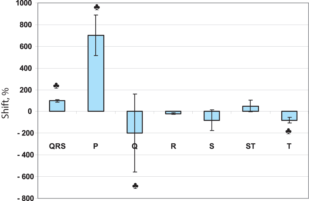Figure 1. Mean values of the shifts of ECG parameters with respect to the background (%) at the time of muscular failure. Legend: ♣ - at the time of failure the indicator extends beyond the limits of the norm.
