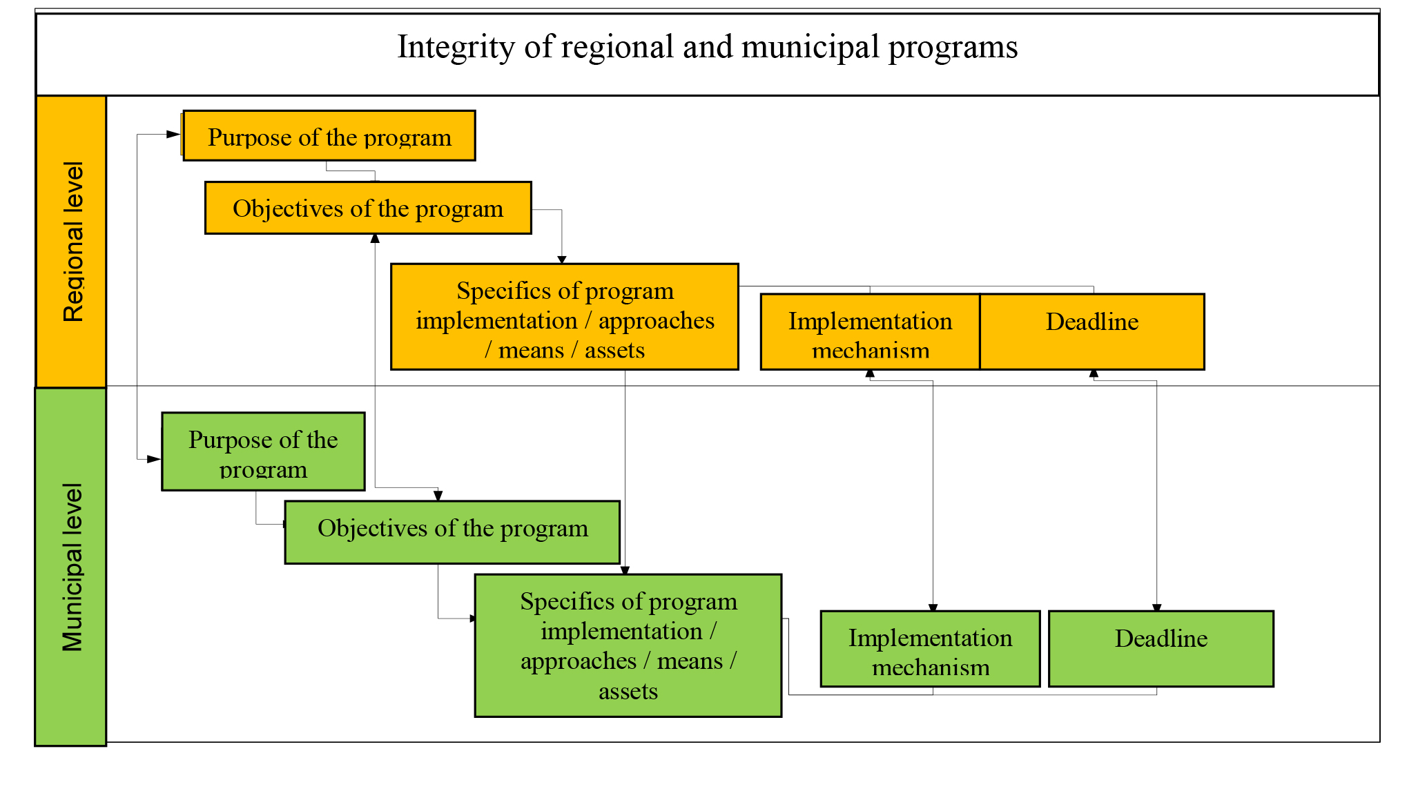 3. Coordination and collaboration between the subjects of physical culture and sports were introduced at regional and municipal levels on the issues of establishment and regulation of integrated approaches of target programs development, adoption and implementation in the field of physical culture and sports. The scope of activities comprises provision of consistency and coherence of purposes, objectives, content, phases and indicators of the target programs (Diagram 3).