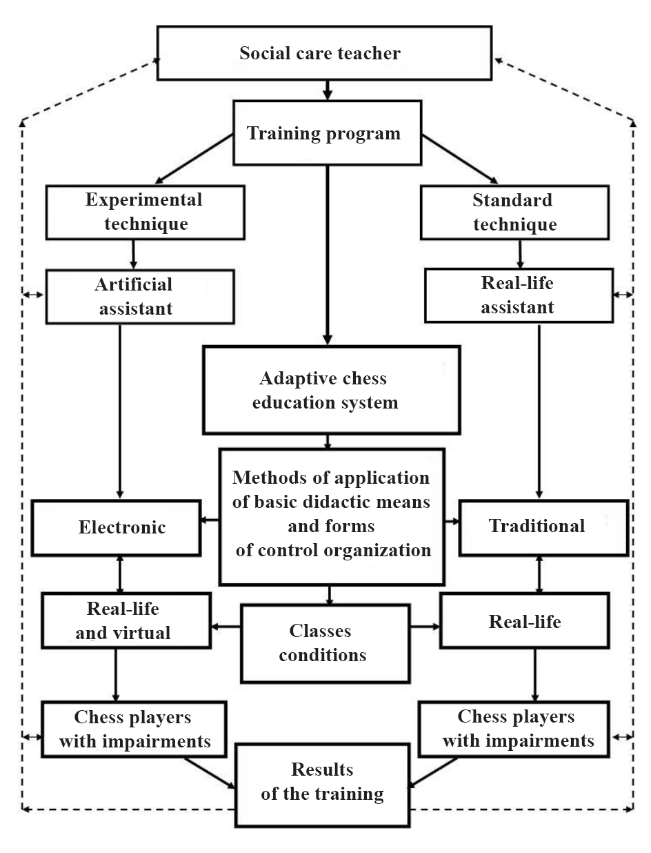 Teaching the basics of adaptive chess sport can also be carried out remotely, by means of programmed learning using audio-visual information and communication technologies (ICT), which is schematically shown in the left column. Complex usage of remote and traditional forms of teaching is also possible.