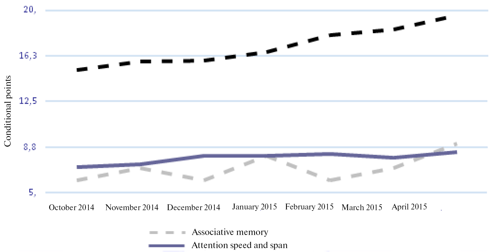 Students treated chess as a means of diversified personality development – development of diligence, will power, discipline, proactive attitude and creativity. These personality traits manifested during a game of chess made it possible to expand reflective capacity and increase cognitive reserves of the brain. Chess analysis that the students did while playing the game reveals new thinking strategies and tactics having a positive impact on the formation and course of cognitive processes that contribute to recreational restoration of psycho-physiological functions of the body. Intellectual and cultural approach to playing chess reveals the potential for the development of aesthetic and heuristic functions of the student's personality. Training sessions based on the elements of chess art therapy and music and fairy tales content of multimedia educational computer programs supported the dynamics and the reversibility of the nervous processes as the main characteristic of logical thinking. The dynamics of the intellectual development level that was identified and validated by researchers, thus making it possible to substantiate the effectiveness of chess as a specific type of APhE for people with impairments, is the main parameter stating the amount of cognitive reserve of the brain. Development dynamics of the students’ IQ is shown in Figure 1. Analysis of the research results reveals the dynamics of the IQ growth rate during a year of up to 30% compared with the original data at the beginning of the academic year. In line with the research objective there was carried out the testing of the psycho-physiological characteristics - of the development level of associative and operative memory, attention span and switching, abstract-logical and operative thinking. The data in Table 1, presented in the graphic form in Figure 2, are indicative of the dynamics of development of psycho-physiological characteristics of chess players caused by a system of intensive recreational and recovery techniques and methods.