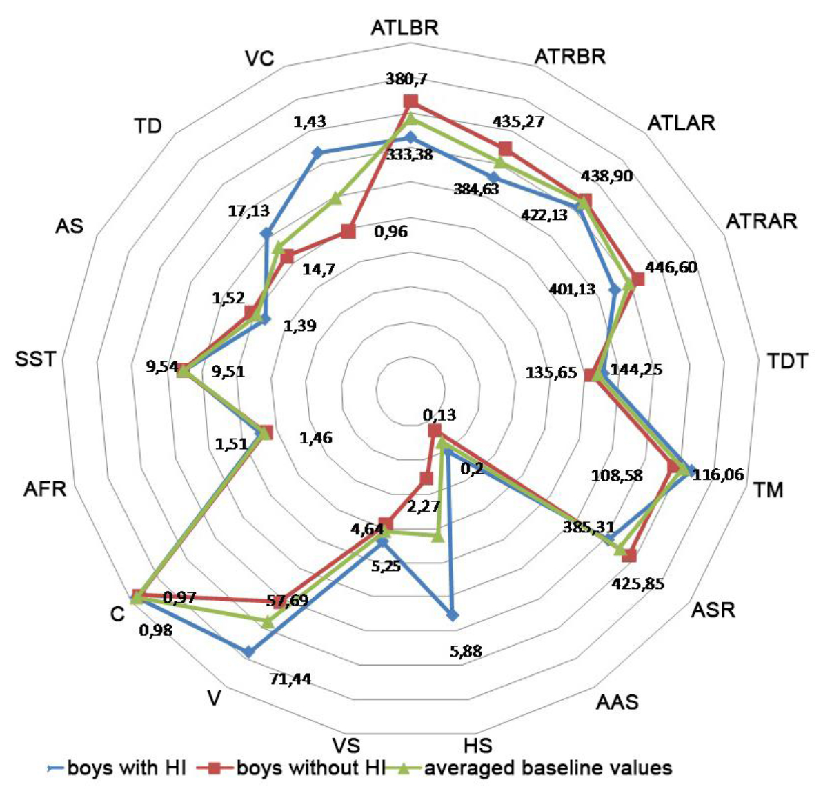 Fig. 2. Mean-group values of psychomotor functions in boys