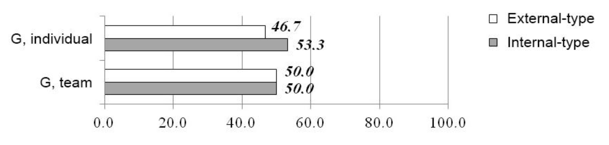 By contrast to boys, girls are generally more responsible for own health (Fig. 6). In both team and individual sports, the percentage ratio of the external and internal types is almost the same, in the first instance it matches – 50%, while in the second one there is a 6.6% difference.