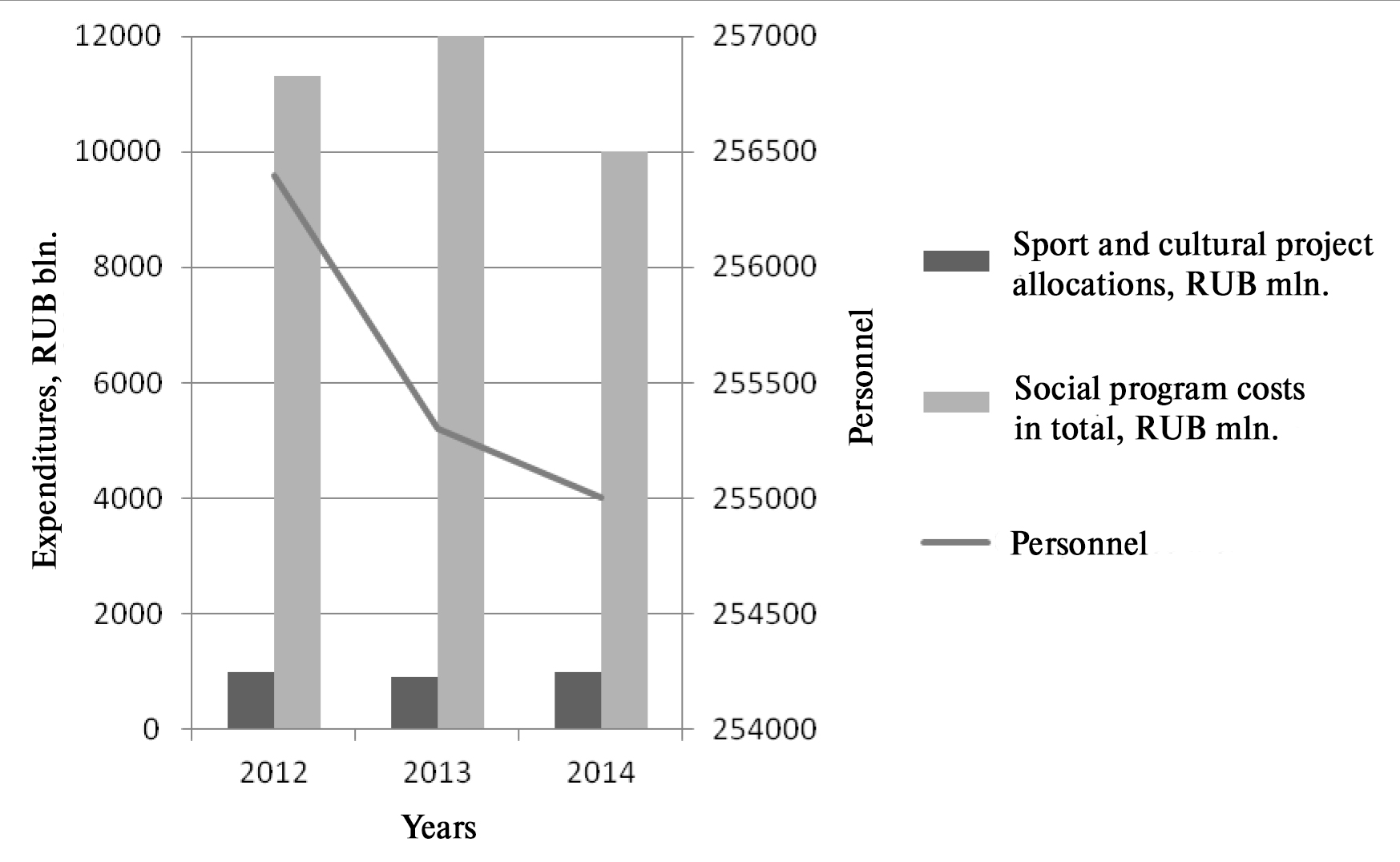 It was the “Sport and Cultural Project Management” Corporate Social Program of the Rosatom SNEC that has been one of the principal corporate social development initiatives for the last few years, with the Rosatom SNEC financing for the relevant mass sport and cultural events estimated at about RUB 1 billion per year. This amount is reported to make up around 10% of the total allocations for the social programs, with the annual allocations per staff member amounting to RUB 3.9 thousand per year. Given on Figure 1 hereunder is the Rosatom SNEC flow of social expenditures for 2012-14.