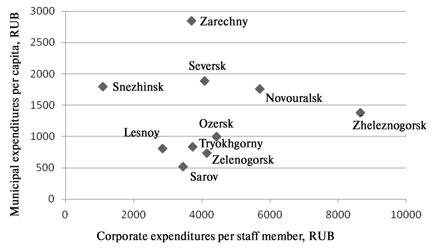 We used the following information sources for the study: Rosatom SNEC Public Annual Report of 2014; annual reports of the Rosatom SNEC subsidiaries; municipal budgets of the Zheleznogorsk, Zarechny, Zelenogorsk, Lesnoy, Novouralsk, Ozersk, Sarov, Seversk, Snezhinsk and the Tryokhgorny CATD; reports of the (CATD) governments available on the Consolidated Portal of the Closed Administrative Territorial Divisions of Russia and on the Rosatom SNEC Public Board website.