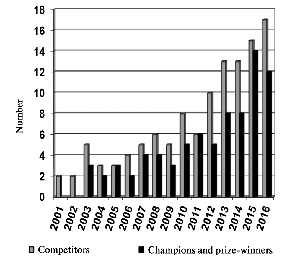 Figure 2. Success records of the Udmurt Republic competitors in the school All-Russian Physical Education Olympiad finals in the period of 2001 through 2016.