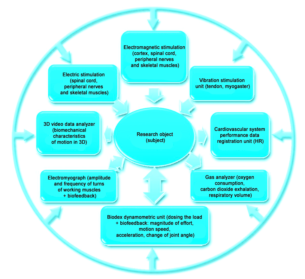 The performance stimulation units give the means to activate different segments of the spinal cord, movement control zones of the brain, peripheral nerves and skeletal muscles. All units of the Computerized System are interconnected that gives the means to track, on a real-time basis, the functional changes, the dynamic and kinematic performance parameters in every motor action.
