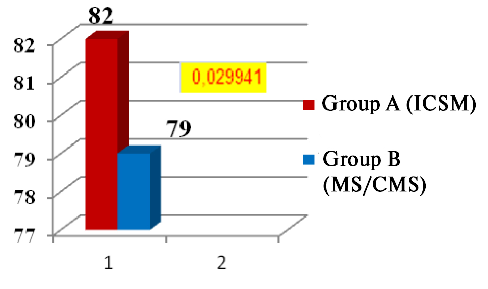 Furthermore, we performed a statistical analysis to find the significant differences in the functionality rates of the top-ranking (ICMS) rhythmic gymnasts rated with the vagotonic type of the autonomic nervous system control of HRV (3 subjects, Group A) versus that of the lower-ranking and less successful in competitions (MS/CMS) subjects diagnosed with the same vegetative balance type (5 subjects, Group B).