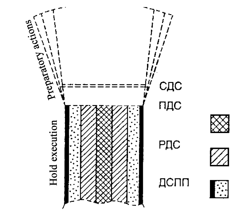 For example, speed-strength martial artists’ techniques are dominated by grabbling to force the opponent to make mistakes when trying to get out of the hold and, hence, obtain a chance to perform his trademark offensive action. The TPS simulator is designed to register the competitive performance rates including the successful offence intervals (SOI); offensive success rate (OSR); average score (AS) etc. i.e. the rates related to the first level of the competitive performance. The second TPS level registers and analyses the process biomechanics with an emphasis on the tactical mastery and trademark action performance rates. Schematically, the action performance sequence and its versions may be presented in the form of a funnel (see Figure 2), with its wide part visualizing the preparatory (entry) phase of the action and the narrow part – the performance technique (А.А. Novikov, 2003).