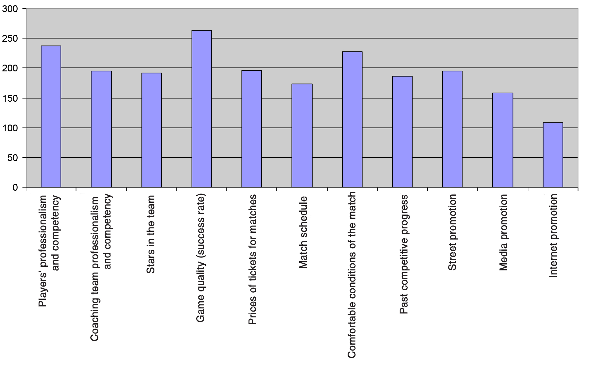 Study results and discussion. The survey data showed that the would-be fans gave the top priority to the team game quality (competitive success) as the most important factor, the opinion being supported by 13% of the respondents. Going next in the list of priorities was the players’ professionalism and competency (game techniques) and service quality on the matches, rated by 11% and 10%, respectively. Ranked number four by the respondents was the coaching community professionalism and competency and prices of tickets for the matches, both rated by 9.2% of the respondents. Ranked on the bottom of the list of priorities were the following factors: stars in the team; past competitive progress; and match schedule: see Figure 1 with the points scored by each of the above factors on the vertical axis and the factors listed on the horizontal axis.